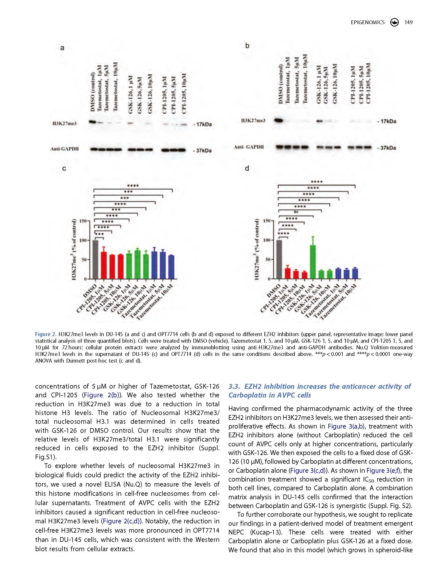 Aggressive Variant Prostate Cancers (AVPCs) are incurable malignancies. Platinum-based chemotherapies are used for the palliative treatment of AVPC. The Polycomb Repressive Complex 2 (PRC2) promotes prostate cancer progression via histone H3 Lysine 27 tri-methylation (H3K27me3). EZH2 encodes the catalytic subunit of PRC2. A recently developed nucleosome capture technology (Nu.QⓇ).measures H3K27me3 levels in biological fluids. EZH2 inhibitors (EZH2i) are being tested in clinical trials. We hypothesize that epigenetic reprogramming via EZH2i improves the efficacy of Carboplatin in AVPC and that EZH2i activity can be measured via both cellular- and cell-free nucleosomal H3K27me3 (cf-H3K27me3) levels.